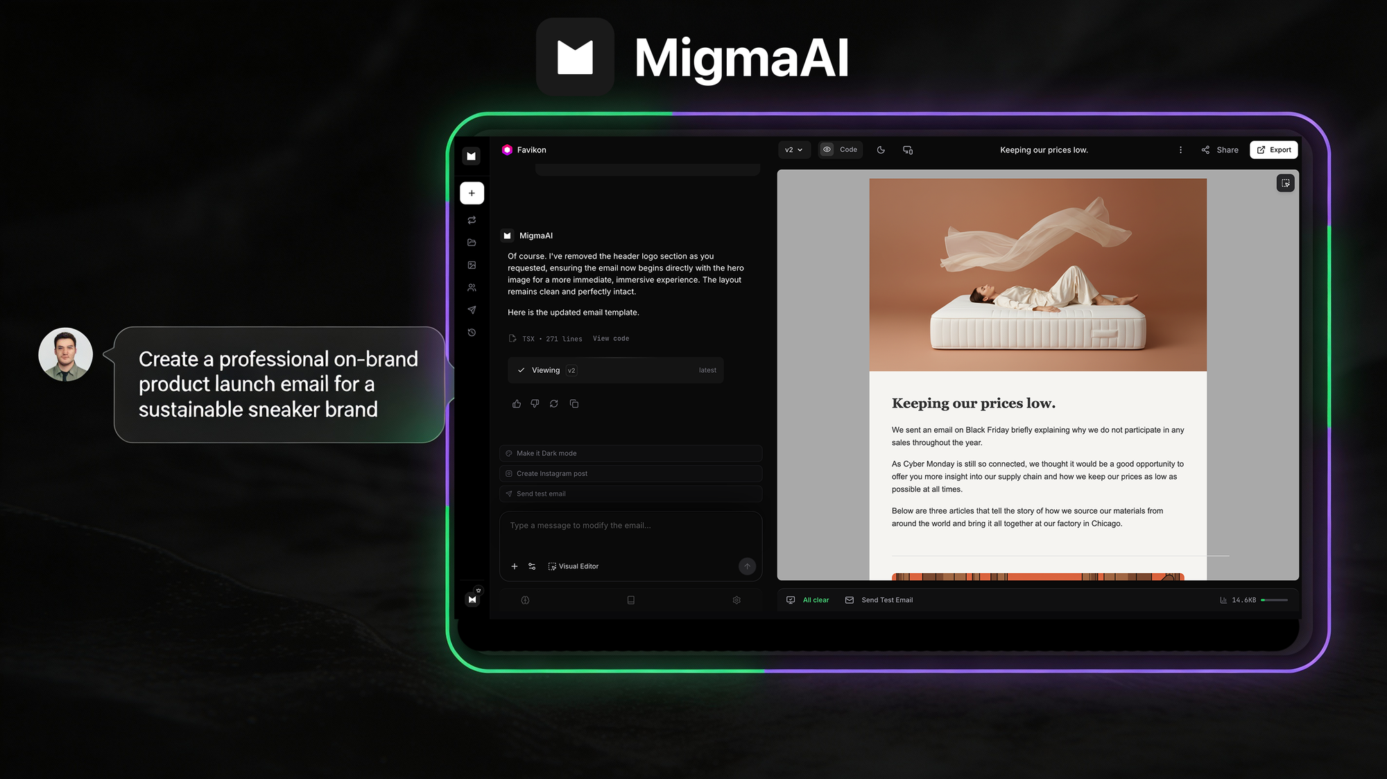 Migma.ai converts natural language descriptions into professional, pixel-perfect email templates using AI-powered code generation. It functions as the "Lovable of email," allowing users to describe their vision and receive clean, production-ready HTML and CSS instantly (see the generated image above).